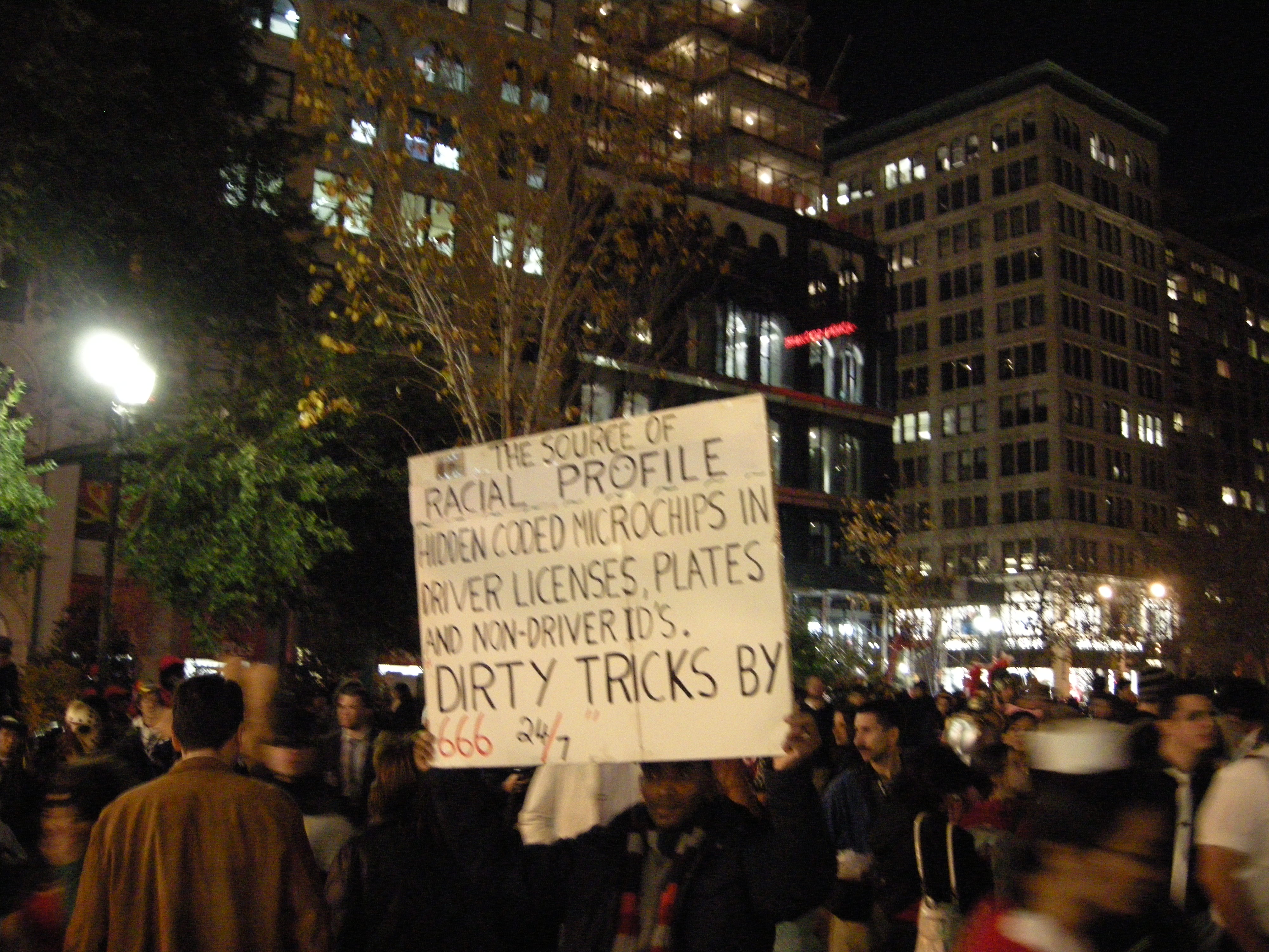 Then, Union Square for more madness! "THE SOURCE OF/ RACIAL PROFILE/ HIDDEN MICROCHIPS IN/ DRIVER LICENSES, PLATES,/ AND NON-DRIVER ID'S./ DIRTY TRICKS BY/ 666 24/7". Is this a costume or for serious?